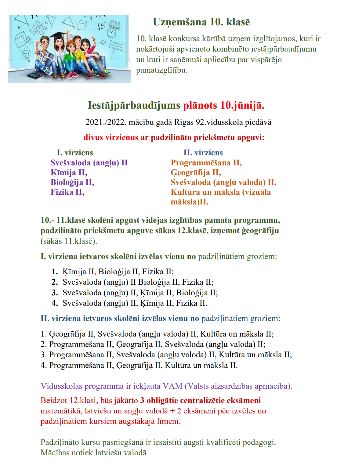 Jaunumi 19 April 2022 Cienījamie vecāki un skolēni! Visa nepieciešamā informācija par uzņemšanu skolā 10.klasē ir pieejama skolas mājas lapā sadaļā "Par skolu" - " Uzņemšana 10.klasē"